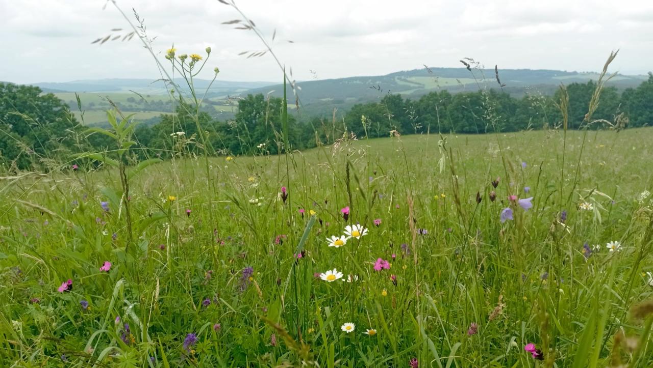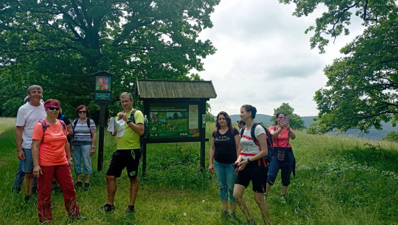 Po krátkém tekutém povzbuzení celkem pro dvacet účastníků tady začalo naše pěší putování Národní přírodní rezervací Porážky přes krásně rozkvetlé bělokarpatské louky plné polních květin a bylin. Po zdolání dvěstěmetrového převýšení se nám otevřely nádherné pohledy na okolní krajinu, rozsáhlé louky, lesy a vesnice pod nimi.