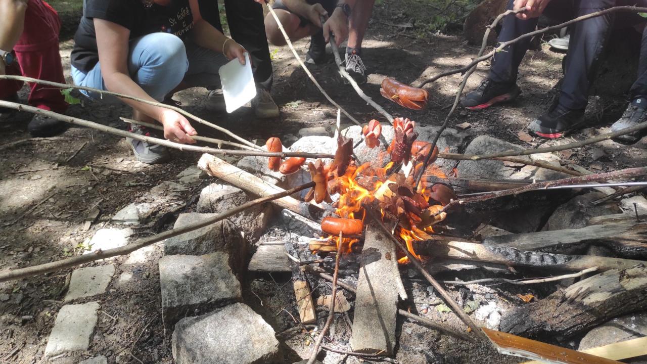 Občerstvovací zastávka s opékáním špekáčků byla ve velmi pěkném prostředí u chaty slavkovských myslivců. Samozřejmě nechyběla ani káva se zákuskem, limonáda a správná dezinfekce, tu nám zabezpečili a dovezli příznivci turistiky, kterým zdravotní stav nedovolil tentokrát jít s námi.