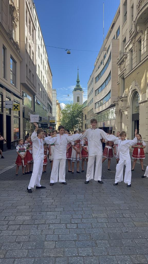 K pěkným okamžikům patřila i spontánní „ulicovka“: během přestávky před hlavním pořadem začal Háj hrát přímo na ulici a přilákal spoustu diváků. Přidali se i muzikanti z jiných muzik, děti z Lúčánku si kolem pobrukovaly a obdivně sledovaly své starší kamarády muzikanty. Rodiče, kteří nás do Brna doprovodili, si udělali pohodlí kolem nich a užívali si jedinečnou atmosféru města. Brno tak dostalo ochutnávku Horňácka mimo pódium a to úplně zblízka.