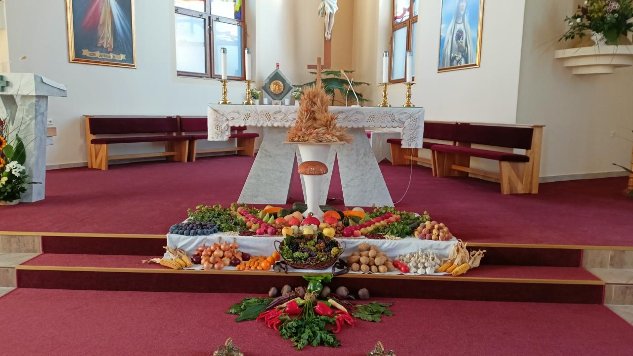 V neděli 21. září, tak jako každý rok, byla v kostele Panny Marie Růžencové sloužena P. Petrem Wnukem děkovná mše svatá za úrodu. Slavnostní mše svatá byla ozdobena výpěstky a plody našich zahrádek, sadů, vinohradů a polí, které nám Bůh během roku dopřál a které před oltář naaranžovala paní Anna Sečkařová s vnučkou Adriankou. Poděkování symbolizuje taky to, abychom nezapomínali na lidi kolem sebe, abychom uměli děkovat a nacházeli radost v tom, že to co dostáváme, není jen pro nás samotné, ale pro dobro celé naší farní rodiny.Nesení obětních darů krojovanými účastníky bylo doprovázeno zpěvem smíšeného kostelního sboru se slovy díků Pánu Bohu za vše, čím nás během roku obdaroval. Za přípravu, zpěvy i účast krojovaných srdečně děkujeme.